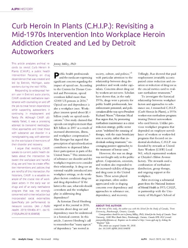 I argue that revisiting C.H.I.P. speaks to current public health debates about the intersection between the workplace and harmful drug use and how to create effective interventions and policies that are mindful of this intersection. For historians, C.H.I.P. is a valuable example of the crucial role of workplace actors in the early war on drugs and of an early methadone program that was not strongly concerned with crime reduction but incorporated social externalities (specifically job performance) to measure success.