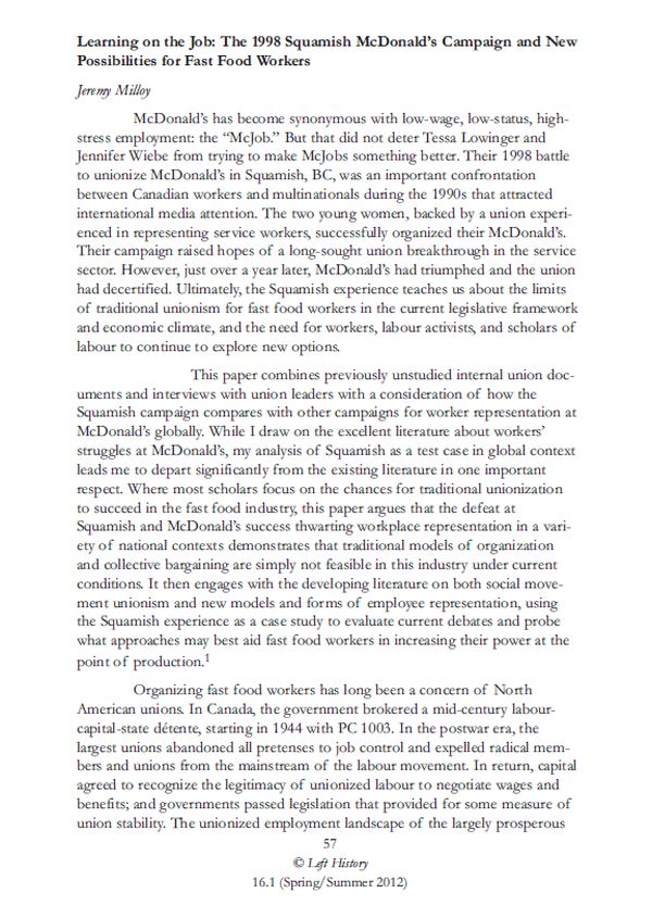 “Learning on the Job: The 1998 Squamish McDonald’s Campaign and New Possibilities for Fast Food Workers.